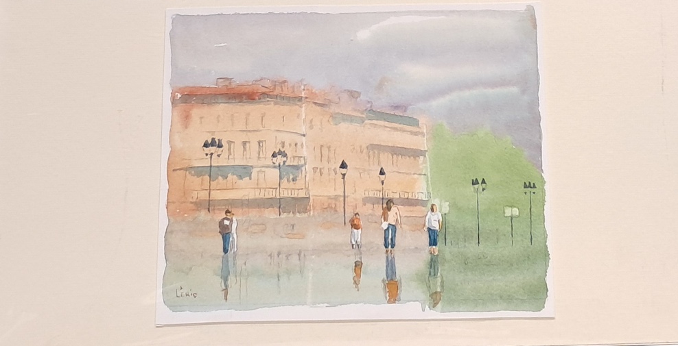 Cette aquarelle délicate capture l’atmosphère paisible du Miroir d’eau, face au Pavé des Chartrons à Bordeaux. Les façades bordelaises, baignées d’une lumière douce, se reflètent subtilement dans la surface miroitante, créant un jeu de transparences et de couleurs pastel. Les silhouettes de promeneurs, légèrement esquissées, apportent vie et mouvement à la composition tout en conservant une grande légèreté.