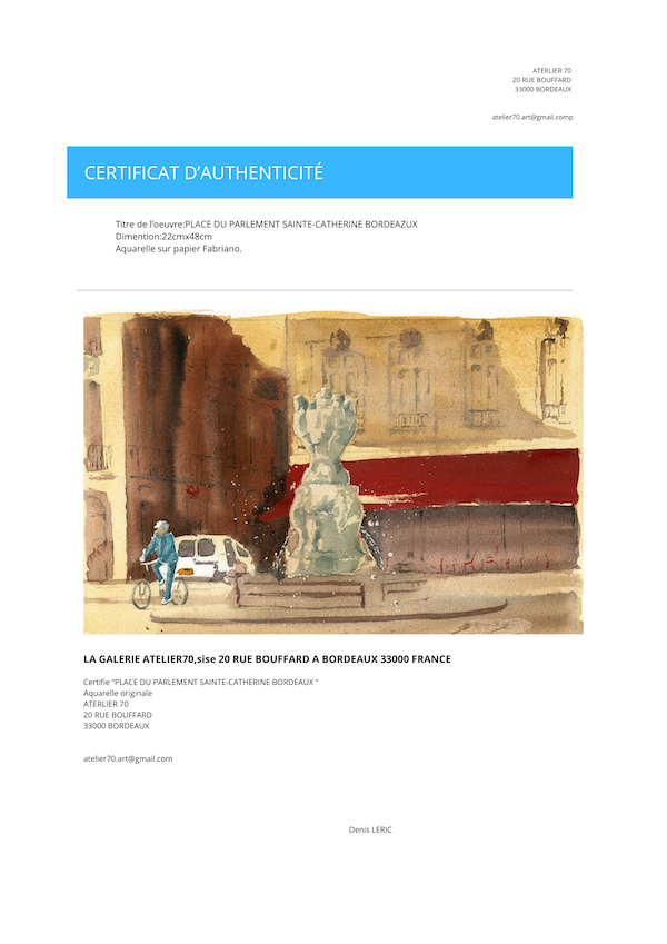 Œuvre originale de l’artiste Denis Leric, cette aquarelle est accompagnée d’un certificat d’authenticité, attestant de son caractère unique et de sa provenance. Elle constitue une pièce raffinée pour les amateurs d’aquarelle, de scènes urbaines et du patrimoine bordelais