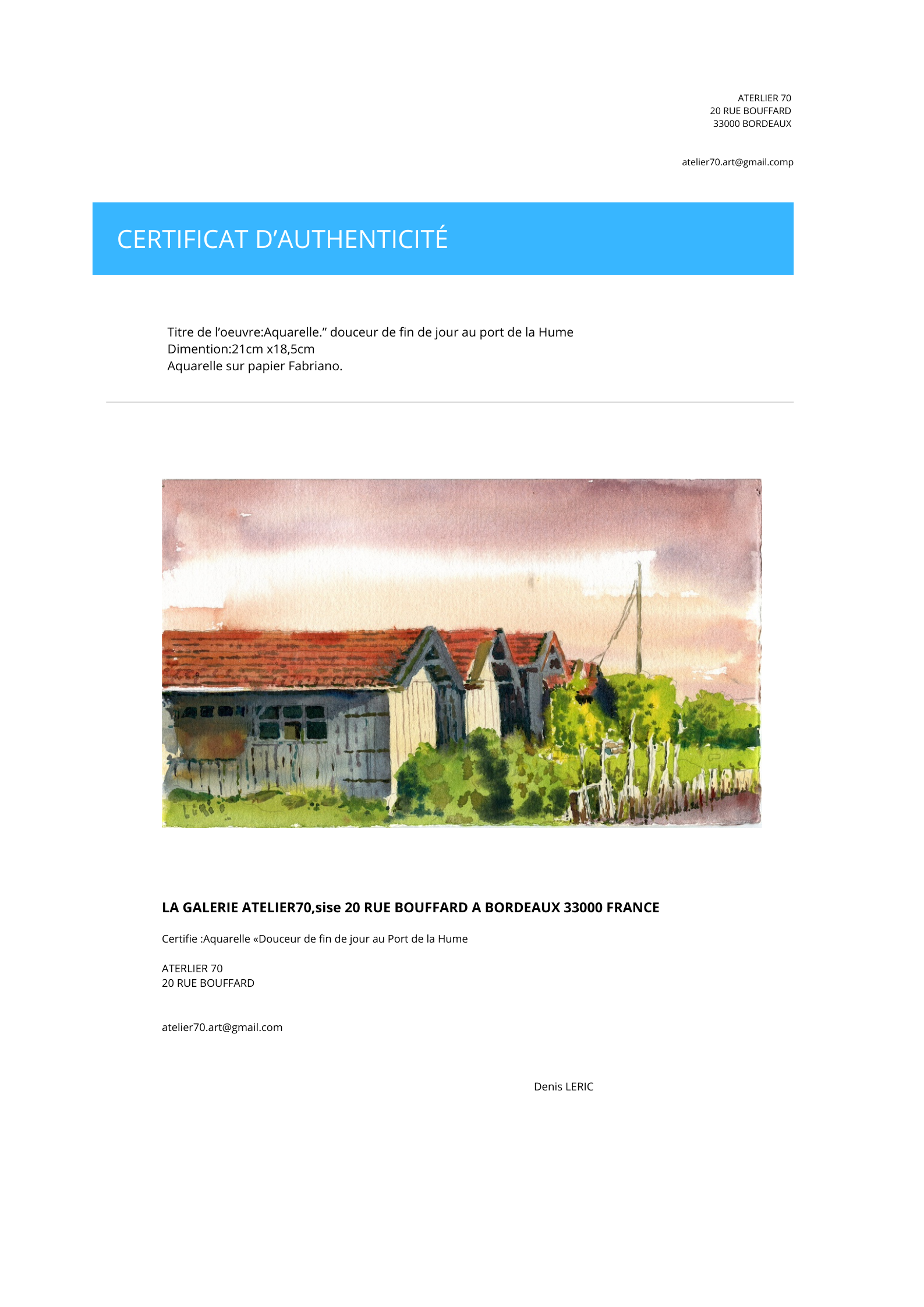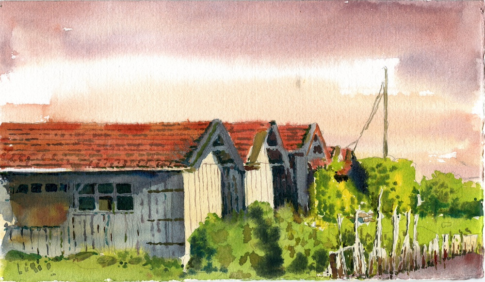 Cette aquarelle capture magnifiquement l’essence paisible du Port de la Hume à Gujan-Mestras. Les teintes chaudes du toit en tuiles et la douceur du ciel au couchant évoquent parfaitement cette atmosphère typique du Bassin d’Arcachon, entre terre et mer.