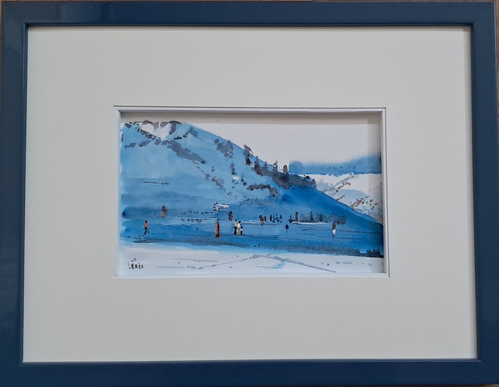 Dans cette aquarelle, Léric capture l’essence même de la haute montagne avec une économie de moyens qui confine à la poésie. Dominée par une palette de bleus profonds et cristallins, l’œuvre joue sur les contrastes entre la masse imposante des versants enneigés et la fragilité des silhouettes humaines qui parsèment le premier plan