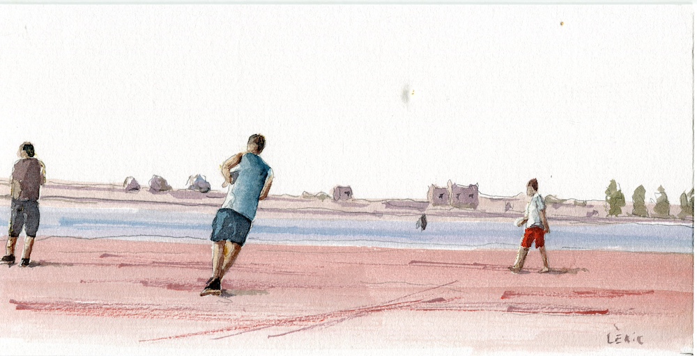 Dans cette composition lumineuse, LERIC explore la vaste étendue de la plage d’Essaouira, un espace de liberté où les silhouettes semblent flotter dans la lumière. L’économie de traits et la maîtrise des blancs du papier suggèrent la chaleur du soleil et le souffle des alizés. Les touches de bleu et de rouge ponctuent l’immensité du sable rosé, créant un rythme visuel qui célèbre la vie quotidienne sur la côte marocaine avec une élégante simplicité.