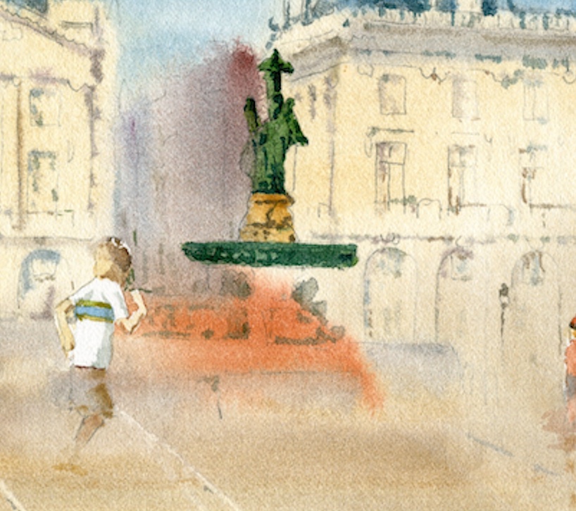 Mouvement et Vie : Au premier plan, une silhouette esquissée semble s’élancer, rappelant la vitalité de ce lieu de rencontre, entre le miroir d’eau et l’architecture classique.