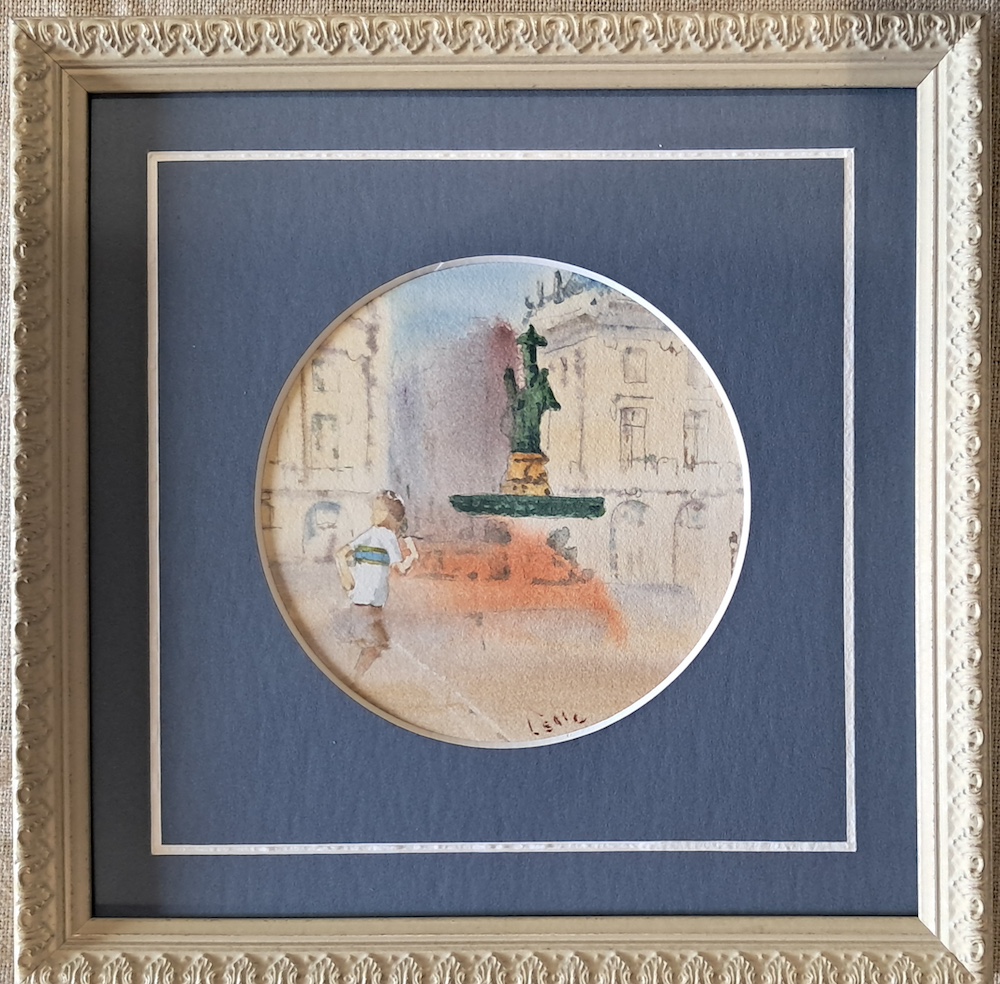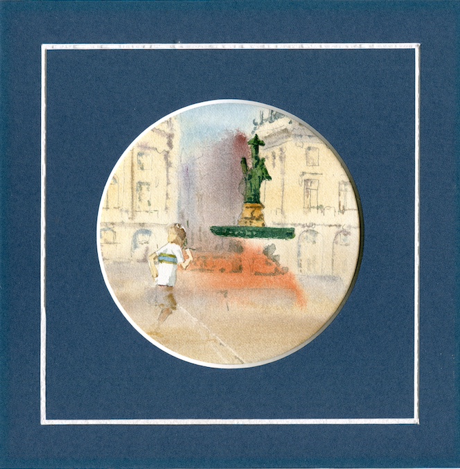 Cette aquarelle délicate nous transporte sur l’emblématique Place de la Bourse, saisie dans un instant de pure légèreté. À travers un format circulaire original — tel l’œil d’un voyageur ou l’objectif d’un souvenir — l’artiste laisse respirer la lumière blonde des façades bordelaises.