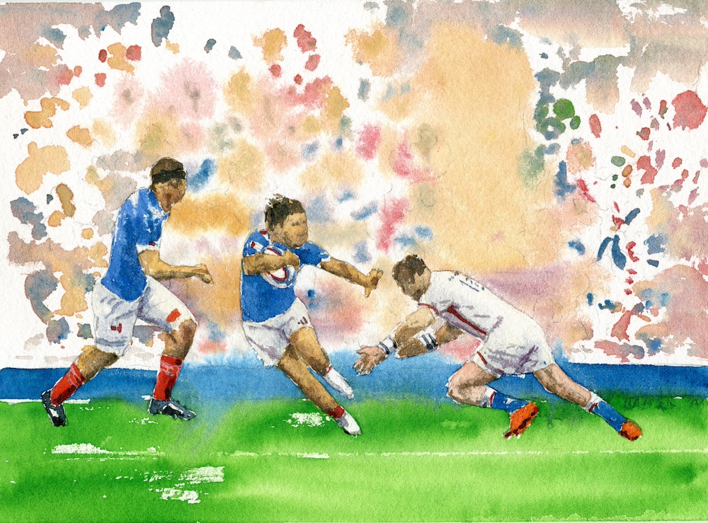 Dans cette aquarelle vibrante, le mouvement devient émotion. Trois joueurs s’élancent dans un même souffle, suspendus entre tension et grâce, comme figés au cœur d’une seconde décisive. Les couleurs éclatées de l’arrière-plan évoquent la clameur invisible du public tandis que la pelouse, fraîche et lumineuse, ancre la scène dans la réalité du jeu.