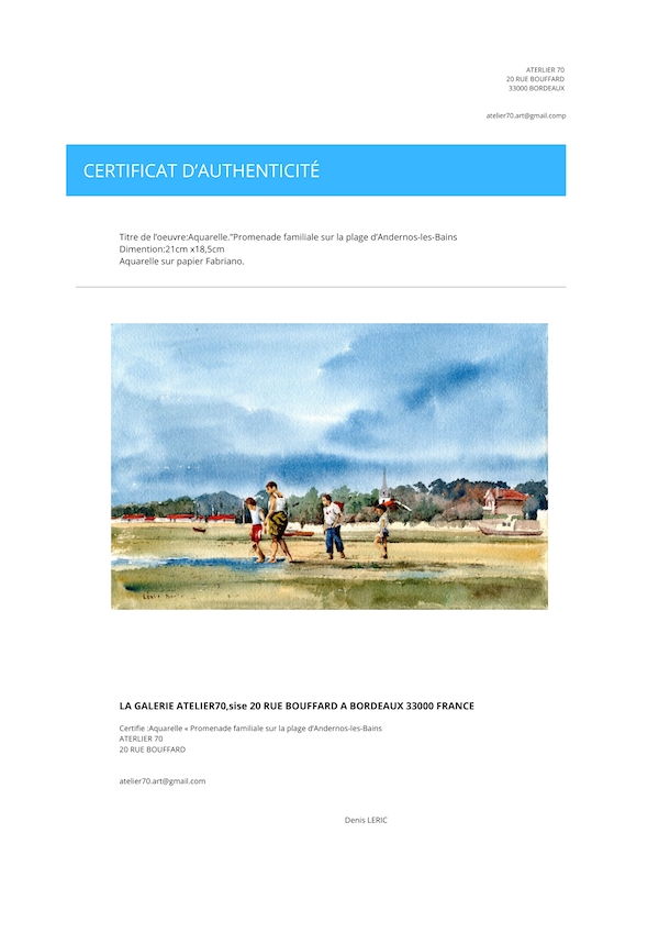 Cette aquarelle représente une scène de vie paisible sur la plage d’Andernos-les-Bains, au cœur du Bassin d’Arcachon. Une famille marche les pieds dans l’eau, portée par la douceur d’un ciel d’été et la lumière changeante du littoral atlantique.