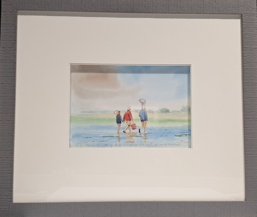 Dans cette aquarelle originale réalisée sur papier Arches, trois silhouettes avancent doucement dans l’immensité lumineuse du rivage. La mer s’est retirée, laissant place à un miroir d’eau calme où le ciel se reflète, brouillant les frontières entre terre et horizon.