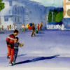 Cette aquarelle évoque la simplicité d’un instant partagé, entre promenade et rêverie. Elle raconte Essaouira dans ce qu’elle a de plus subtil : un équilibre fragile entre présence humaine, espace infini et poésie du quotidien marocain.